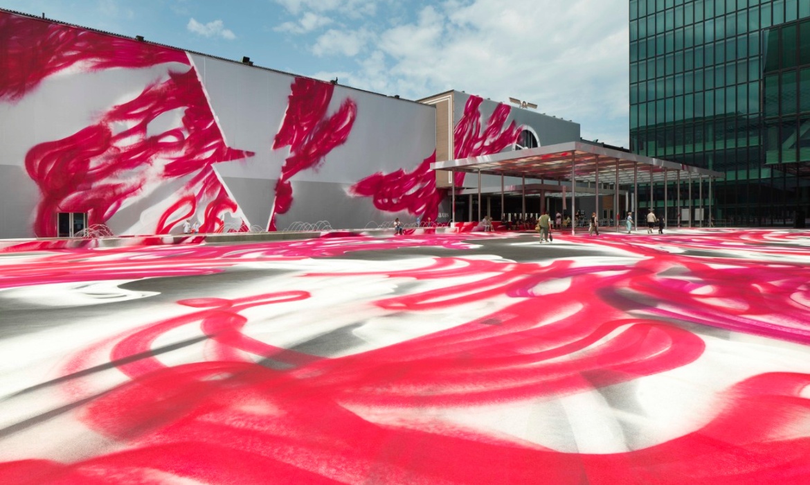 German artist Katharina Grosse has long been a fixture of Art Basel, and to celebrate the iconic art fair's 55th edition, she created the largest urban art installation of her career. Grosse is known for her large-scale spray-painted artworks, and she certainly brought her artistic energy to the Messeplatz for CHOIR. The piece, which was on view until June 22, saw Grosse spraying white and magenta forms across the Heurzog & de Meuron-designed space.